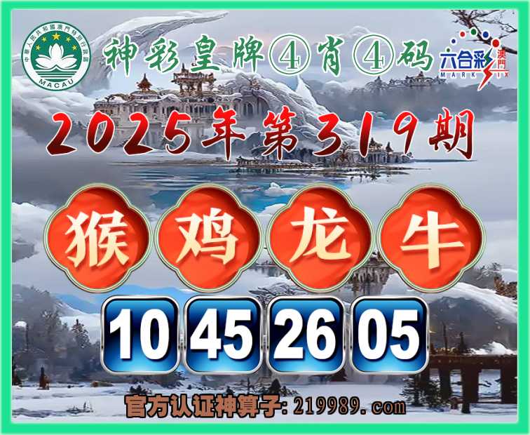 319期: 🎉『神彩皇牌』 🎉④肖④码🎉【猴龙牛】【10.45.26.05】开:鸡45